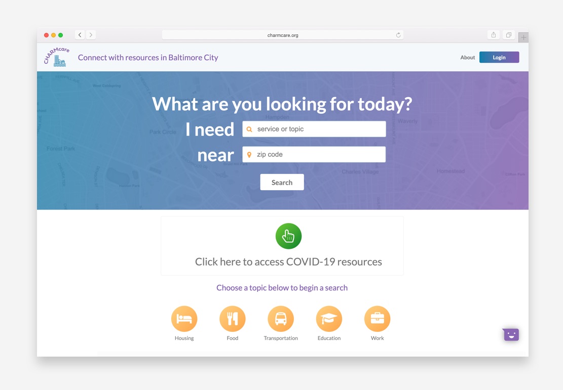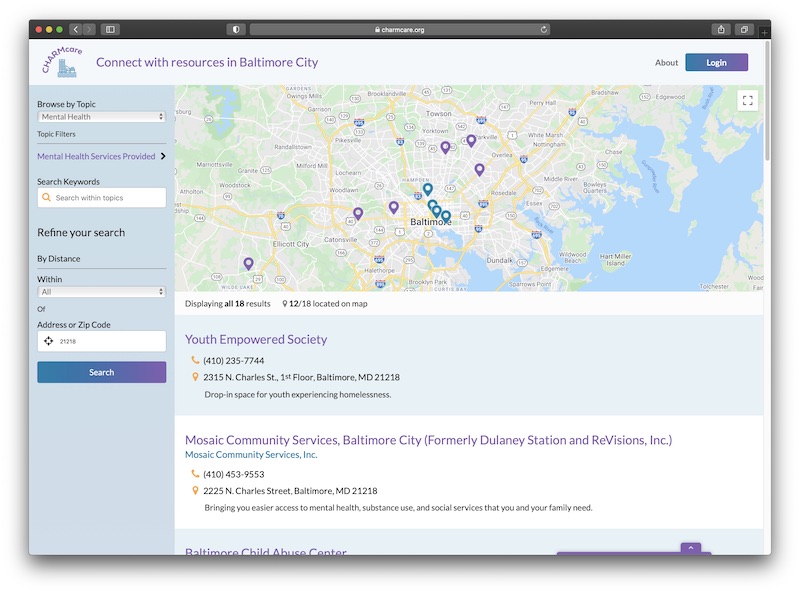 One of BHCD’s offerings is an open-source directory, CHARMcare, that guides users to free or low-cost resources in Baltimore. The site is a custom-designed search engine for Baltimore social services that includes info on emergency help, education, food access, employment and legal assistance organizations. Its results can be filtered by proximity and keywords, and a built-in Google Translate function makes the website accessible to a broader group of non-English speakers.