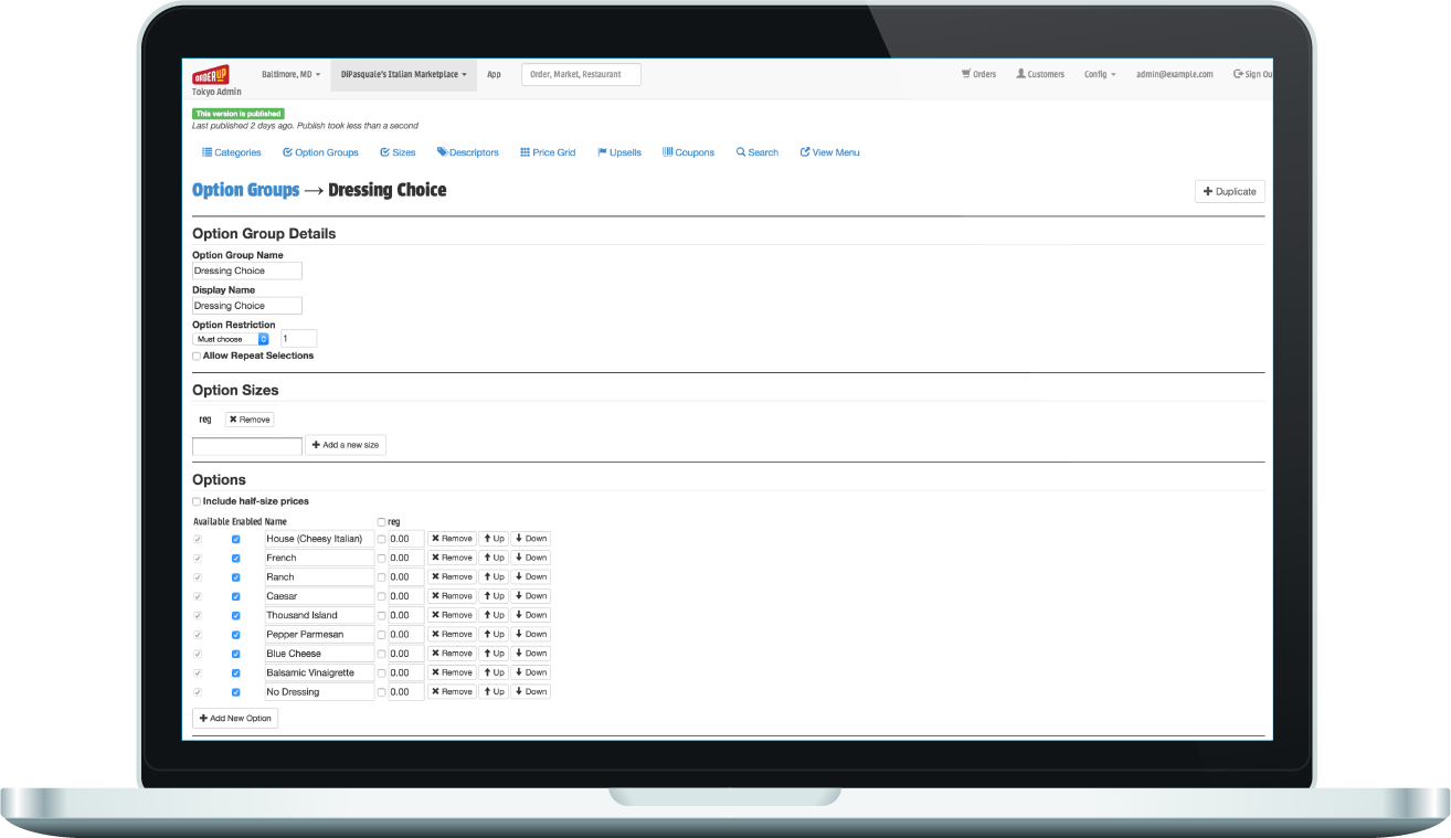 Because of the menu builder’s inefficiency, OrderUp and SmartLogic wanted to change the data model of the menu builder app, not just the code. The new data model and interface is much more efficient. For example, the new software makes it easy to change options that appeared in many menu items—so when a restaurant runs out of onions, employees only have to make one change to remove the onion option throughout the entire menu. Additionally, SmartLogic and OrderUp streamlined the process of repricing menu items and sides through the use of a price grid. With this system, all prices are displayed on one page, and can be changed collectively.